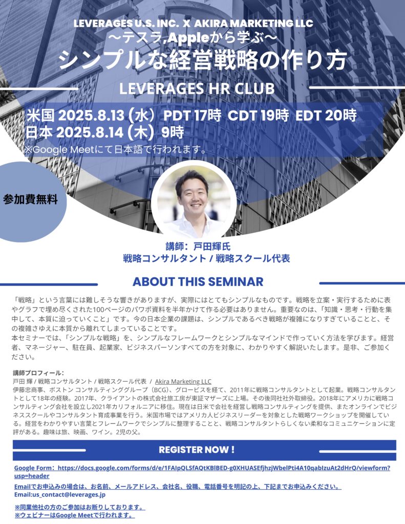 2025年8月13日(水)セミナー案内 カリフォルニア時間の8月13日(水)5:00 PM(日本時間では8月14日(木)9:00 AM)から北米の日系企業向けのセミナーに登壇します。 セミナーに参加する