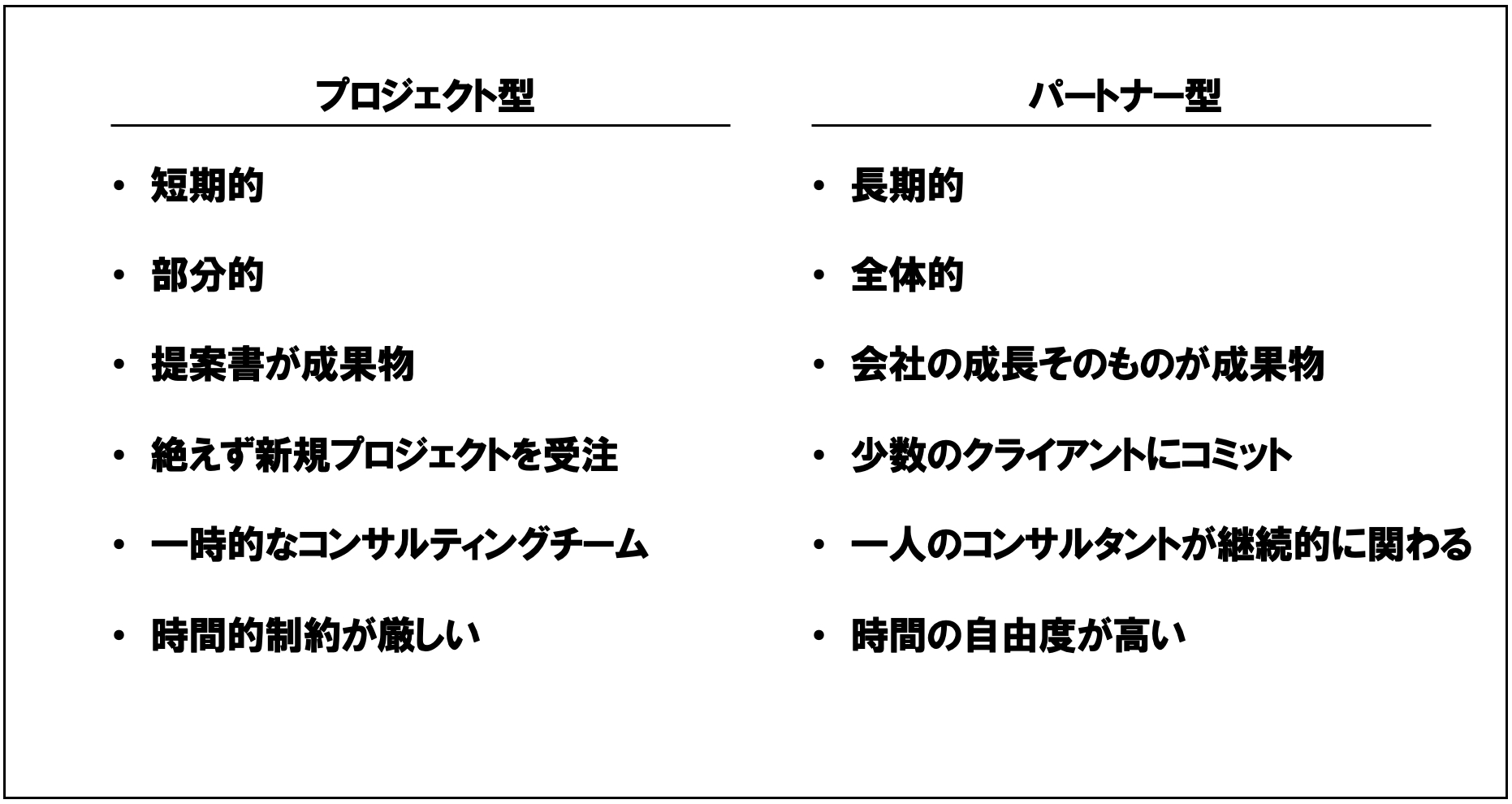「パートナー型」は「プロジェクト型」と反対の概念になります。短期的で期間限定のプロジェクト型のコンサルティングと異なり、パートナー型の戦略コンサルティングはクライアント企業の経営パートナーとして、長期的に(数年間〜10年以上)経営に関わり伴走します。そして、社長・CEOと同じ目線で会社の構造変化と売上・利益の向上を目指します。