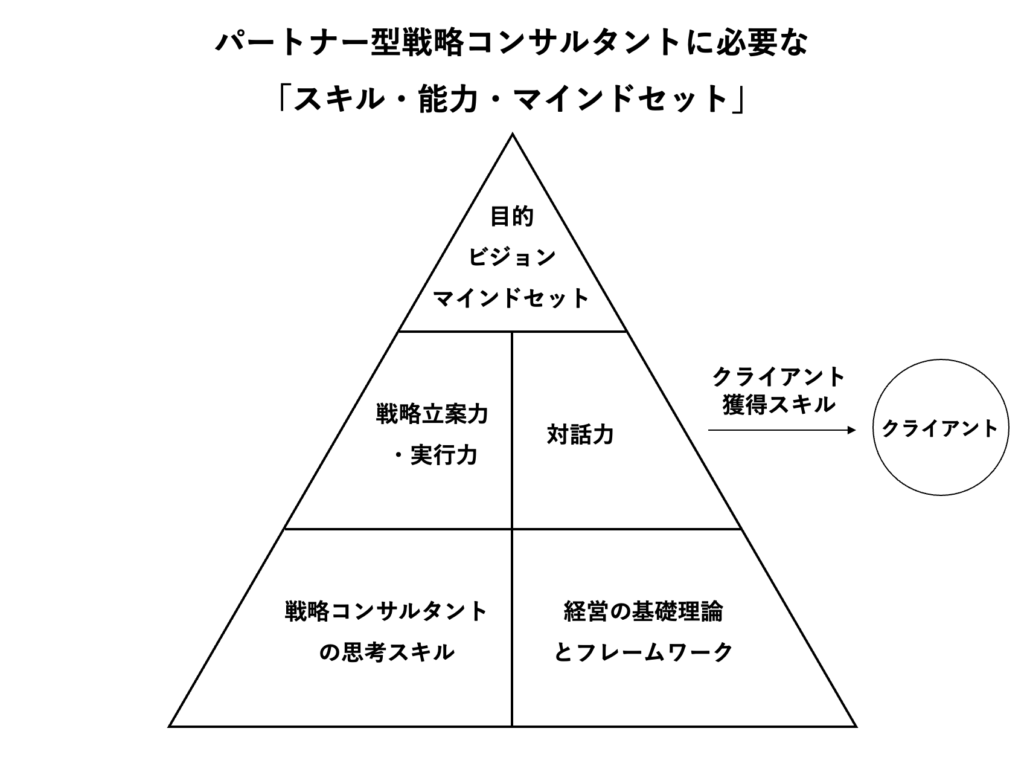 パートナー型 戦略コンサルタント養成講座は学んだことを実践し、実際にクライアントで成果を出すことを重視しています。そのために以下の「スキル・能力・マインドセット」を身につけます。